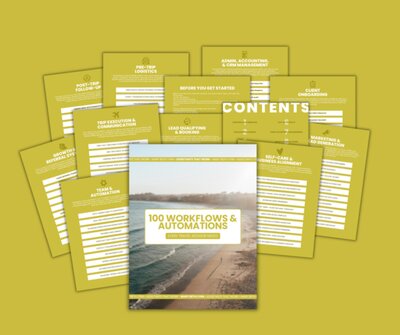 Inside this powerful digital resource, you’ll find 100 real-world workflows and automations to streamline every stage of your travel business—from lead generation to post-trip follow-up. Organized into 10 key categories (like marketing, onboarding, admin, and even self-care), this guide shows you exactly where to create more ease, efficiency, and delegation.